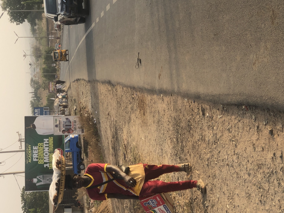 A man in a red and yellow outfit carries goods on his head and shoulder, next to a road. A cardboard box is on his left. A large advertisement for Mati Kaftan Royale Academy advertises free tailoring training for beginners. The ad features an image of a white Kaftan and sewing machines. The road has traffic, including a black SUV and a yellow tricycle. A smaller advertisement and a blue vehicle are also visible. There are power lines to the left and what appears to be a hill or mountain in the background.