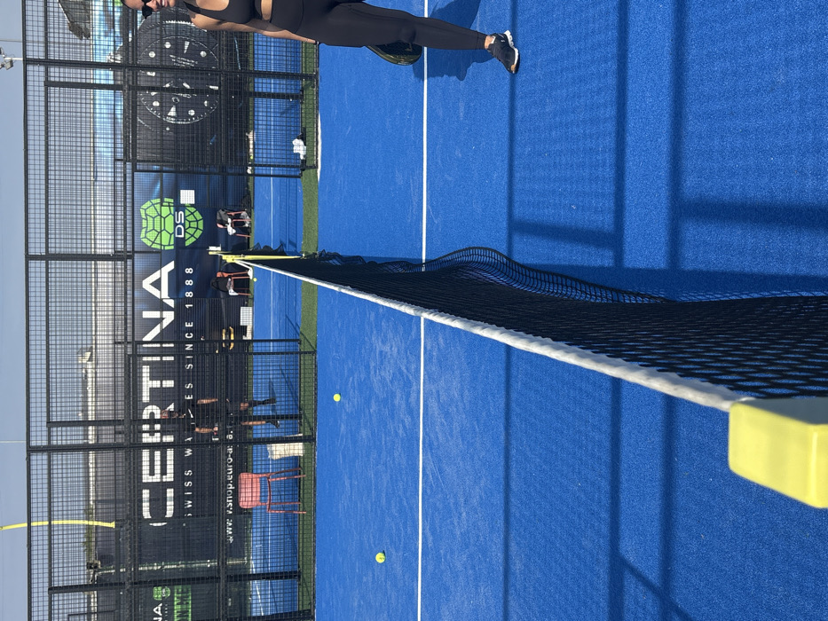 The image depicts an outdoor padel tennis court at the DS Padel Club in Raanana, Israel. The court features a bright blue synthetic playing surface with white demarcation lines, bisected by a black net with a white top border. A yellow net post is visible in the lower left foreground. Two yellow padel balls rest on the blue surface. The court is enclosed by black metal mesh fencing, against which black banners displaying "CERTINA SWISS WATCHES SINCE 1888" and a green "DS PADEL" logo are mounted. In the right foreground, a female subject, visible from the mid-thigh up, wears a black sports bra, black leggings, and black athletic shoes with white soles. She wears dark sunglasses and holds a black padel racket in her right hand. On the opposite side of the net, partially obscured by the mesh fencing, a male subject in dark clothing is standing. A red plastic chair and a white cylindrical object are situated behind the male subject near the court's perimeter. The scene is under bright daylight conditions, casting distinct shadows on the court surface.