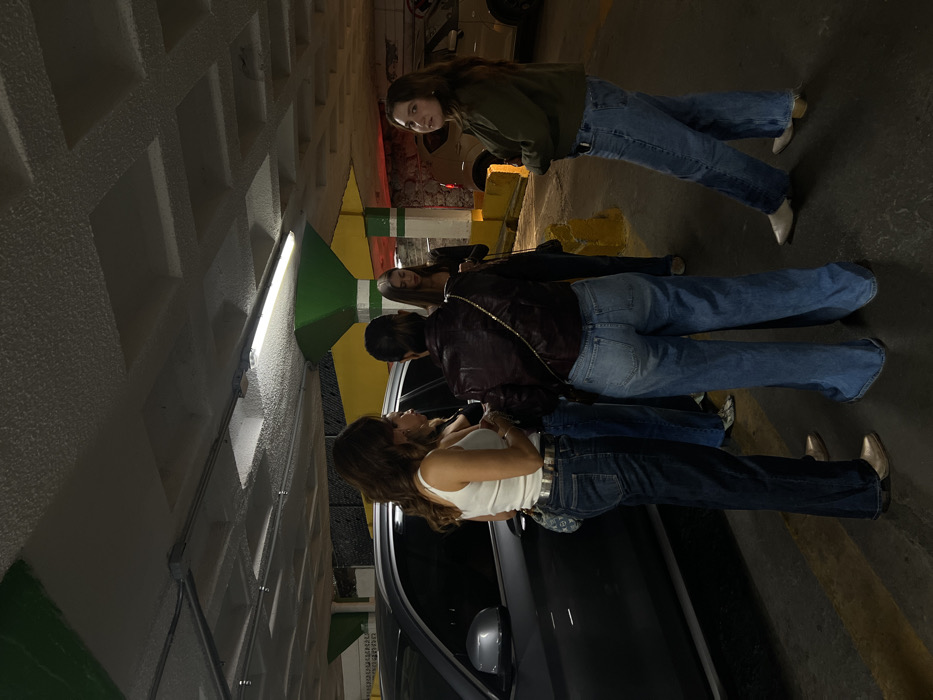 The scene depicts five females gathered within an illuminated section of a concrete parking garage in Guanajuato City, Mexico. **Environment:** The overhead concrete ceiling features recessed square panels and exposed conduits, with multiple fluorescent light fixtures providing illumination. Large pillars, painted with green and white horizontal stripes, punctuate the space. One pillar also exhibits a yellow section. The ground is paved, possibly asphalt, with faded yellow markings. A dark grey SUV is parked on the left, partially obscuring the leftmost individual. In the far background, a lighter-colored vehicle is partially visible near a stone wall, which shows a reddish glow. **Individuals:** 1. **Leftmost:** Partially visible from behind, presenting long dark hair and a dark top. 2. **Second from left:** Standing with her back to the camera, she wears a white tank top, dark blue jeans, a metallic silver belt, and gold-toned shoes. A light-colored shoulder bag with a distinct pattern is slung across her body. 3. **Center:** Positioned with her back to the camera, she wears a dark reddish-brown leather-like jacket, light blue wide-leg jeans, and gold-toned shoes or boots. A delicate gold chain or strap crosses her upper back. 4. **Fourth from left:** Mostly obscured by the person in the center, she has long dark hair and wears dark attire. 5. **Rightmost:** Facing the camera, she has long brown hair and wears a dark olive-green jacket, blue jeans, and white pointed-toe boots with a low heel. She looks directly towards the camera with a neutral expression. **Actions/Interactions:** The individuals appear to be conversing or waiting, standing in close proximity to one another. Three individuals face away from the camera, seemingly engaged with each other, while the individual on the far right directly observes the camera. No overt physical interactions are observed.