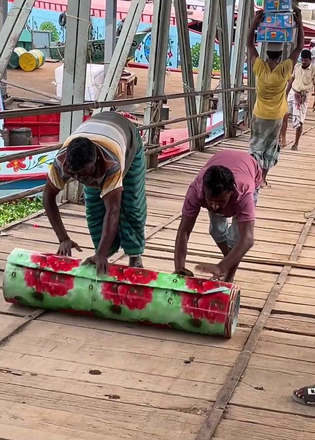 Two men are laboriously rolling a large, cylindrical object across a wooden boardwalk. The object is covered in a green and red floral patterned material. Both men are bent over, hands on the object, pushing and rolling it forward. The man on the left wears a striped shirt and a green and black lungi. The man on the right wears a pink shirt and jeans. Other people are walking on the boardwalk in the background, some carrying items. The boardwalk appears to connect to a pier with several boats docked. The weather appears overcast. The structure above is made of metal beams.
