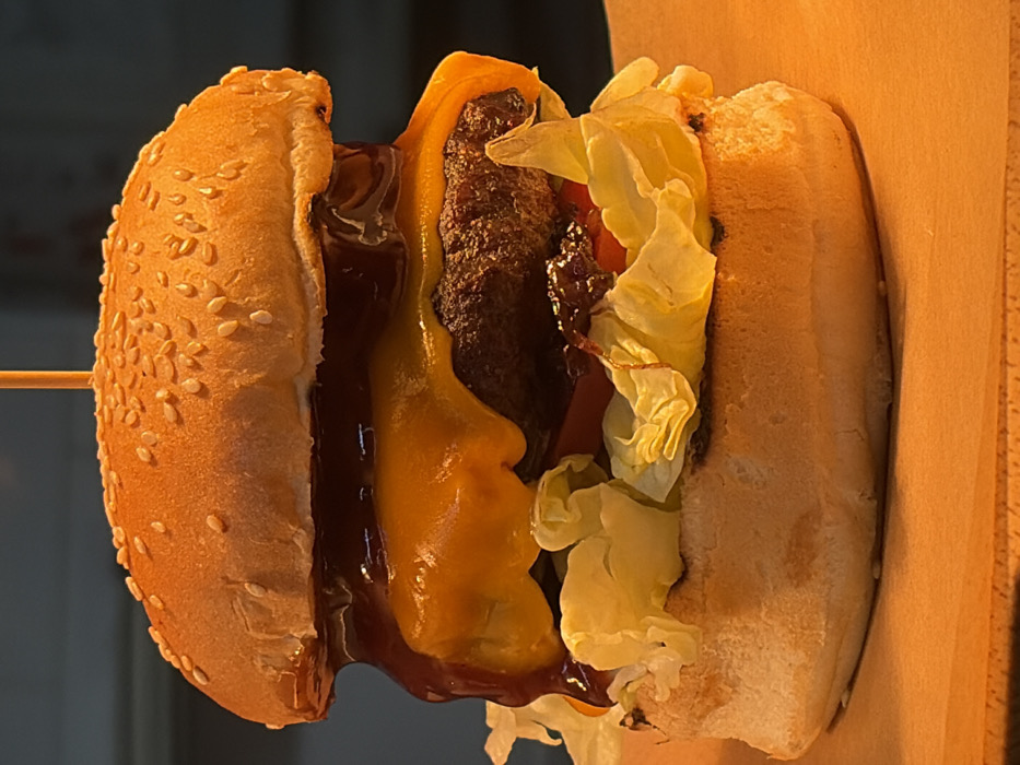 - "A large, fully assembled burger is centered in a close-up, vertical shot, presented in a well-lit indoor setting with a dark, out-of-focus background" by FM-fHMy02, licensed under CC BY 4.0