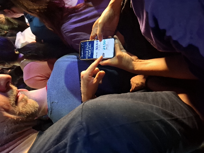 The image depicts a close-up, dimly lit scene within a dense crowd, likely in Buenos Aires, Argentina, though the precise location within the city is not identifiable from visual information. In the foreground, a bearded man, visible from his nose downwards and wearing a dark blue t-shirt, extends his right index finger towards a smartphone held horizontally by another individual whose right forearm and a purple garment are visible on the right. The smartphone's screen prominently displays "RESULTADO PARCIAL" (Partial Result) at the top, followed by percentages "40,84%" and "24,50%", indicative of election results or similar data. Behind the foreground figures, other individuals are visible from the back, including one wearing a light blue sweater with a red collar and another in a pink top. The background is composed of numerous blurred heads and shoulders, confirming a crowded public gathering or event. Artificial light illuminates the central interaction and the phone screen.