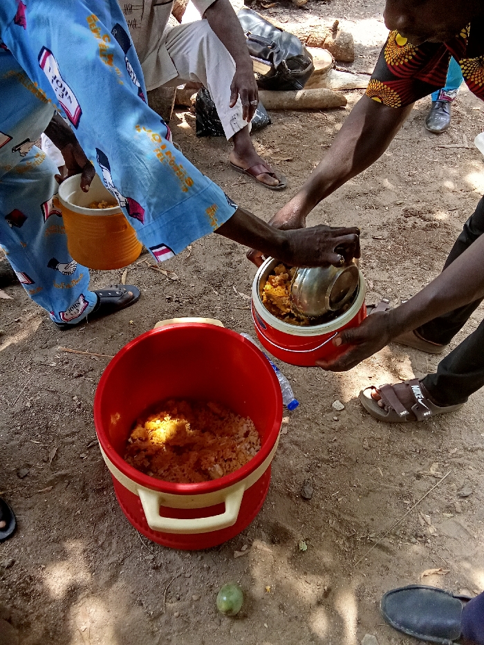 Three people are gathered on a dirt ground in Gudi, Nigeria, which is located at the coordinates 8.884 latitude and 8.266 longitude. The people appear to be sharing food. Two people are holding insulated containers containing food, which is likely rice or couscous. One person is wearing a bright blue shirt and pants, while the other wears a red and black shirt and black pants. The third person is wearing a white shirt and pants. One person is using a ladle to pour the food from a small, silver bowl into a larger insulated container, which is red with a white rim and handle. There is a yellow insulated container nearby, which appears to be empty. There is a small, green fruit on the ground and a partially visible water bottle lying on the ground to the right of the red insulated container. The people are on a dirt ground. The scene is illuminated by the sunlight.