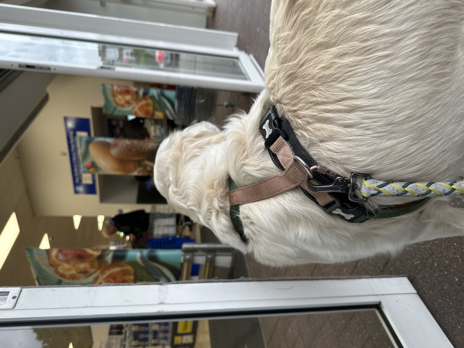 - "A light-colored, long-haired dog, resembling a Golden Retriever, is positioned in the foreground, viewed from the rear, facing into the entrance of a commercial building" by FM-XMDnw2, licensed under CC BY 4.0