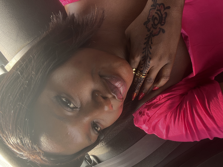An adult female, appearing to be of African descent, is depicted in a close-up, chest-up shot, likely a selfie