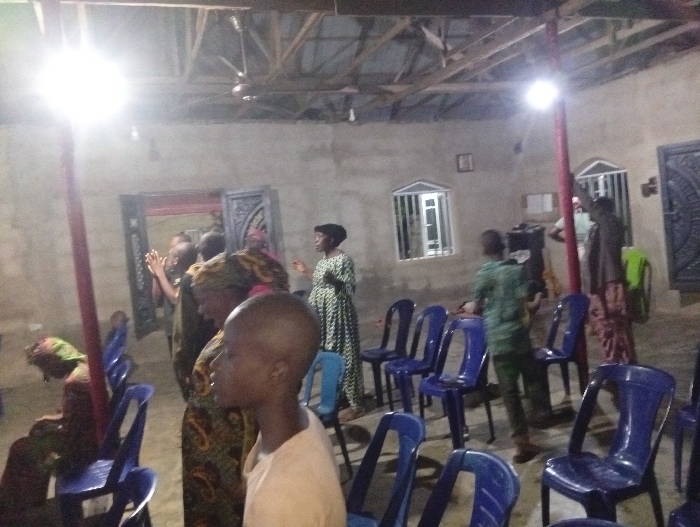 Inside a sparsely furnished building, a group gathers, illuminated by bright lights hanging from the ceiling beams. The room has simple concrete walls with framed windows. Several blue plastic chairs are arranged, some occupied. Individuals, predominantly women, stand facing an unseen focal point. Most are dressed in patterned fabrics and head coverings. A young man with a shaved head stands in the foreground, adding a sense of closeness to the scene.