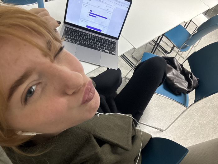 An overhead-angle selfie captures a young individual in a public study or classroom environment in Lille, France