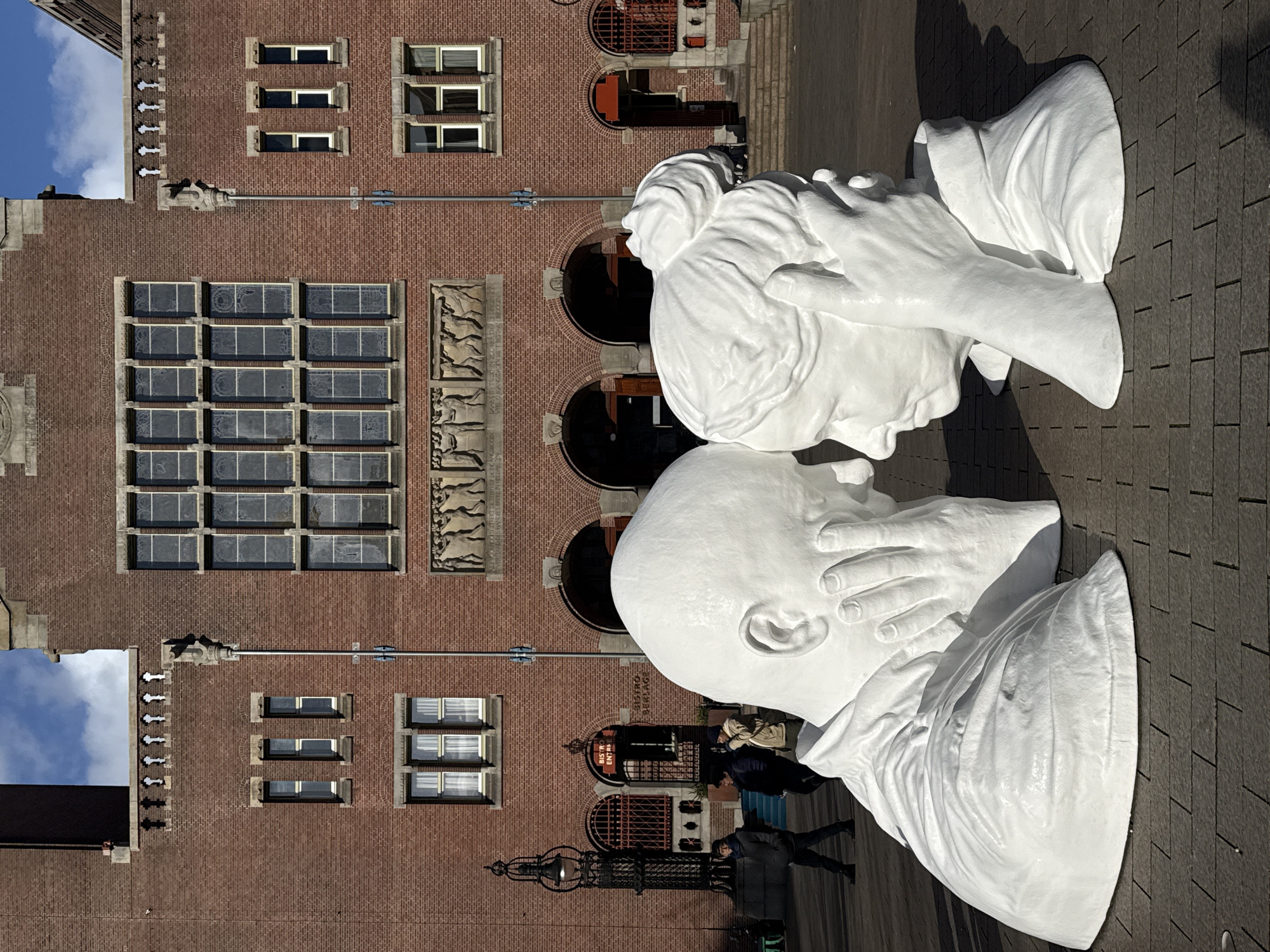 A public square in Amsterdam, Netherlands, features a large-scale art installation foregrounded against the Beurs van Berlage building. Two oversized, white, textured sculptural busts occupy the central foreground: a bald male figure on the left, facing right, and a female figure with hair styled in a bun on the right, facing left. Their foreheads are almost touching, and each figure's inner hand gently cups the outer cheek/ear area of the other, suggesting an intimate interaction. Both busts show partial shoulders and upper torsos, resting on a dark grey paved surface that reflects ambient light. In the mid-ground, several individuals walk past, indistinct but appearing casually dressed. The background is dominated by the multi-story, red-brick facade of the Beurs van Berlage. This building features a large central section with numerous multi-pane windows, flanked by sections with smaller rectangular windows. A stone frieze depicting classical figures in relief spans horizontally above several arched ground-level entrances. One arched entrance on the left displays "BISTRO BERLAGE" above it. An ornate black lamppost stands on the far left. The scene is illuminated by daylight under a partially cloudy blue sky, casting distinct shadows from the sculptures and architectural elements.