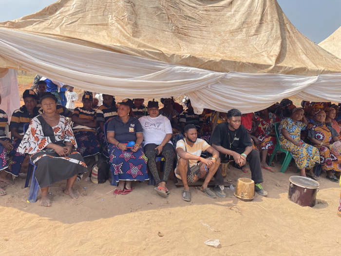 Under a large beige tent, a diverse group of people are gathered. Women in colorful African prints and dark-striped shirts sit in rows. Men, some in casual modern clothes, are seated near drums. The ground is sandy and dry. A bright sky is visible in the distance. The crowd appears to be watching or waiting for something, creating a mix of traditional and contemporary styles.