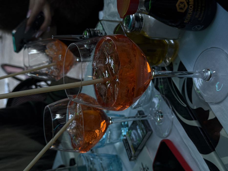 The image presents a detailed, slightly low-angle view of a dining table setting at a restaurant or cafe in Monaco, Monaco. The scene is illuminated by dim, ambient light, suggesting evening hours. Prominently positioned are three stemmed wine glasses, each filled with an orange-colored liquid containing ice cubes and a beige-colored straw; one glass is in sharp focus in the foreground. To the left of this central glass, a partial blue beverage glass is visible, alongside a red-cased smartphone and a dark-colored pack of cigarettes. To the right, a collection of condiments is arranged: a clear glass bottle containing a yellowish liquid with a metal pourer, a salt shaker with a stainless steel top, and a Kikkoman brand soy sauce bottle with a red cap. The table surface is covered by a white tablecloth, partially obscured by a dark-patterned placemat. In the blurred background, a human hand with manicured nails is visible holding a dark-cased smartphone. Other indistinct background elements suggest an outdoor or semi-outdoor dining environment with additional patrons.