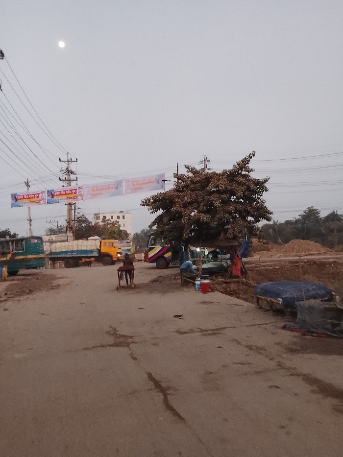 An intersection shows a dirt road with a few parked vehicles, including trucks and a bus. Overhead power lines stretch across the sky, adorned with banners. A bare tree stands to the right, next to a makeshift roadside stall. A man sits in the middle of the road. A mound of dirt is visible behind the stall, and the sky is overcast with a visible moon.