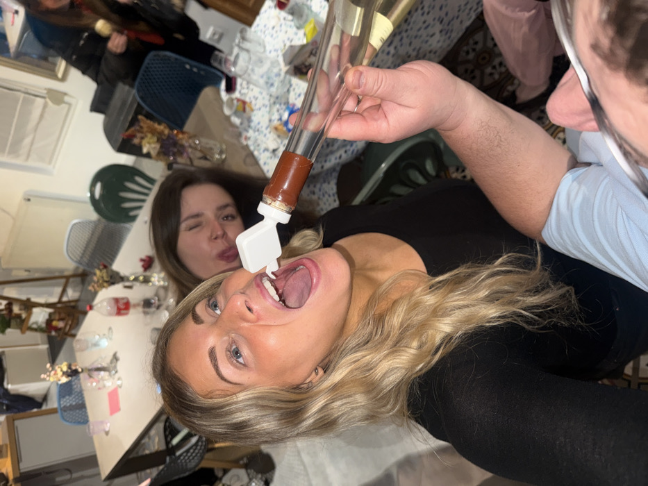 A blonde woman with an open mouth faces the camera, receiving liquid from a tilted bottle with a white nozzle. Behind her, a brunette woman winks, sticking out her tongue in the same direction. The bottle is being held by a person wearing a light blue shirt. A dining table, cluttered with bottles and dishes, stretches into the background, where other people are visible.