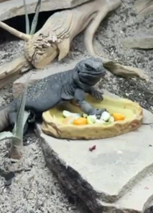 - "chuckwalla lizard, a large, gray reptile, sitting on a rocky surface next to a shallow dish filled with diced vegetables, including carrots and zucchini" by FM-1neqH3, licensed under CC BY 4.0