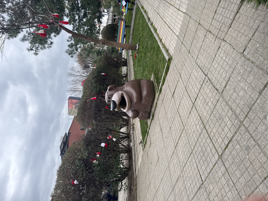 This image captures a urban green space in Plovdiv, Bulgaria, likely situated near the Central Square and Roman Stadium, given the background architecture and park layout. The scene is dominated by a brown, bear-shaped waste bin, stylized with a wide-open mouth, black nose, and dark sunglasses, positioned on a patch of green grass in the middle ground. The grass area is bordered by a concrete curb, separating it from a light grey paved pedestrian path in the foreground, composed of square tiles with visible grout lines. Surrounding the green patch and extending across the mid-ground are dense, low-lying shrubs, predominantly dark green to brown, with some leafless branches indicative of late winter or early spring. Numerous traditional Bulgarian Martenitsi, small decorative objects primarily in red and white, are tied to the branches of these shrubs and a slender-trunked tree located on the right side of the frame. More Martenitsi are visible hanging from the tree's sparse branches. In the background, a multi-story building with red facades and dark upper-level architectural features is visible. A large, abstract mural, predominantly red and black, is visible on the side of an adjacent structure. Under the tree on the right, a multi-colored park bench (yellow, red, blue, green) is partially visible. A person in dark clothing is seated on the far right portion of this bench, with a white, circular object (possibly a plate or container) in front of them. Another indistinct figure is partially obscured by the shrubs on the far left. Several small birds, likely sparrows, are observed on the paved path near the bear bin and on the grass. The sky is overcast, presenting a uniform grey canopy over the scene.