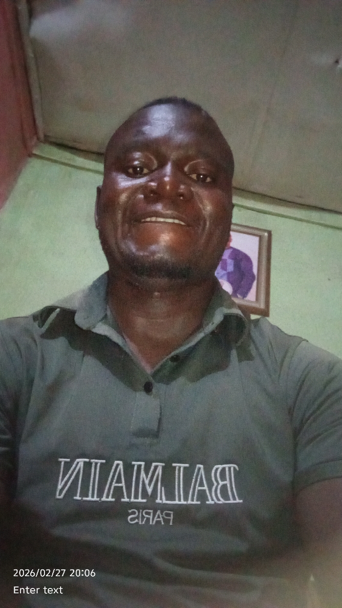 An adult male with dark skin, a bald head, and a short beard is depicted in a front-facing shot, from mid-torso up, smiling directly at the camera. He is wearing a dark olive-green polo shirt with two visible black buttons at the collar. The shirt features white, mirrored embroidered text on the chest, reading "ИIAMLAB" above "ƧIЯA¶" (un-mirrored: BALMAIN PARIS). The subject's skin appears somewhat shiny. In the background, a light greenish-blue wall is visible, with a framed picture containing indistinct purple and blue hues hanging to the subject's right. A light-colored ceiling is also partially visible. A digital timestamp "2026/02/27 20:06" and the text "Enter text" are present in the lower left corner of the image. The scene is located indoors in the city of Gwagwarwa, Nigeria.