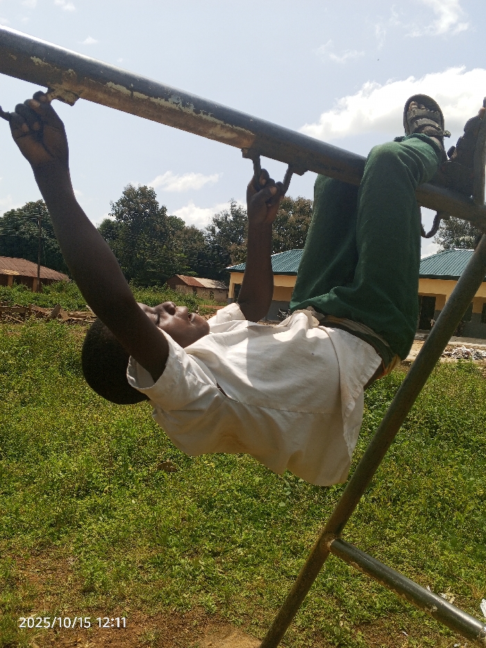 - "The image displays a young individual, likely a male, engaged in an inverted hang on a metal playground bar in an outdoor area of Unguwan Rimi, Nigeria" by FM-dDsul2, licensed under CC BY 4.0