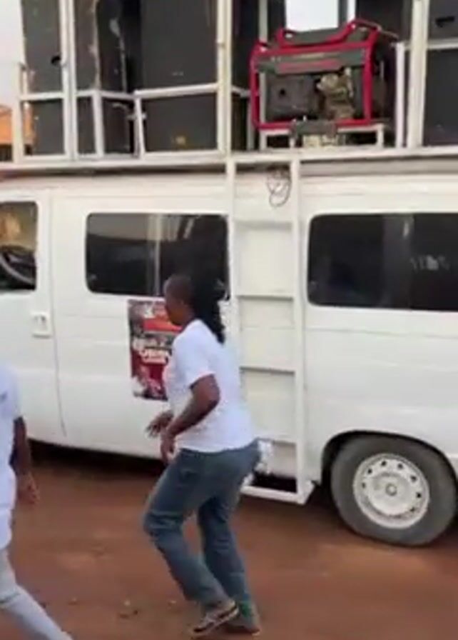 white van with a custom metal frame built on top, supporting a large sound system and a generator. Several people are seen dancing and walking around the van on a red dirt road. One person is standing in the back of the van, which is open like a small stage. The people appear to be enjoying themselves, possibly as part of a parade or street event. The environment suggests a rural or developing area with simple buildings in the background.