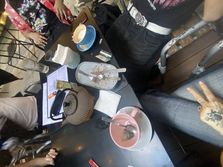 An overhead shot captures a black table setting after a meal. A blue cup and saucer, a messy dessert plate with cutlery, a teapot, napkins, and a pink cup with a spoon are scattered on the table. A menu, phone, and lighter also sit on the table. Parts of three people are visible around the table, one wearing a patterned shirt, another wearing black pants with a white belt, and the third wearing jeans with a hand displaying a peace sign.