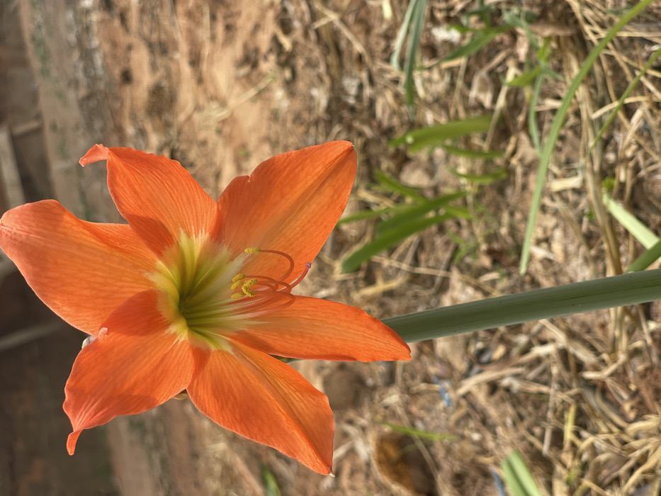 An upright orange Amaryllis flower, with six prominent petals and a yellowish-green throat, is centrally positioned. Yellow-tipped stamens and a curved pistil are visible within the bloom. A single green stem supports the flower, extending downwards out of frame. The immediate background consists of dry, reddish-brown soil, scattered with withered plant matter and sparse green shoots. A blurred, indistinct structure, possibly wooden, is present in the upper right background. This scene is located in Udi, Nigeria.