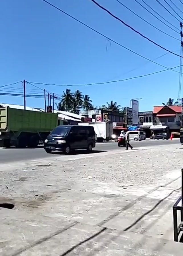 daytime street scene under a clear blue sky. A large green dump truck is parked on the left side of the road, and a black van is driving towards the right. A person in a white shirt is crossing the street. Two individuals on a red scooter pass by on the left side of the road. Utility poles and power lines are visible overhead. Palm trees and buildings line the opposite side of the street. The road surface appears uneven and cracked. The video seems to be taken from a slightly elevated position, possibly from a sidewalk or building.