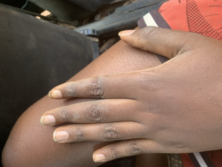 This image, captured in Gidan Jatau, Nigeria, depicts a close-up view of a left human hand, palm-down, resting on a bare thigh