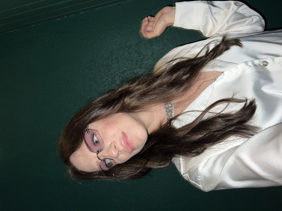 A woman with long brown hair poses in a white button-down shirt. She wears pink-tinted, rimless glasses. A thin silver necklace with letters spells out "COPENHAGEN" on her neck. The background is a dark green, possibly a wall. The photo appears to be taken from a slightly angled, overhead perspective.