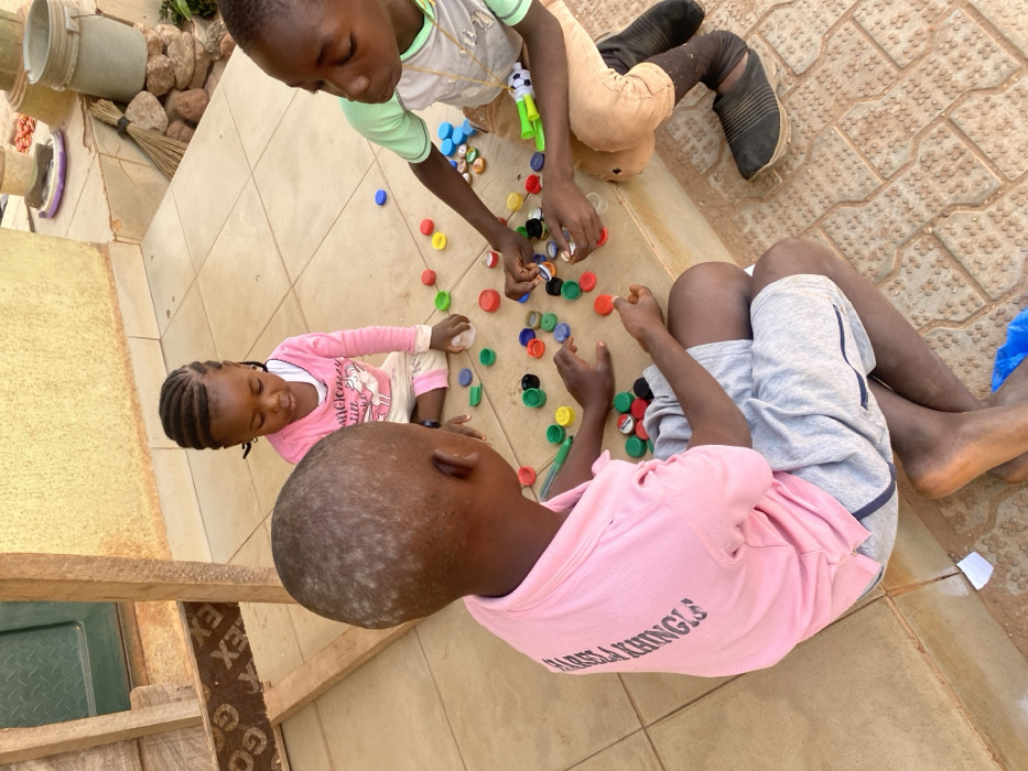 - "Three children are sitting on a tiled floor, playing with colorful bottle caps" by FM-nrUyz2, licensed under CC BY 4.0