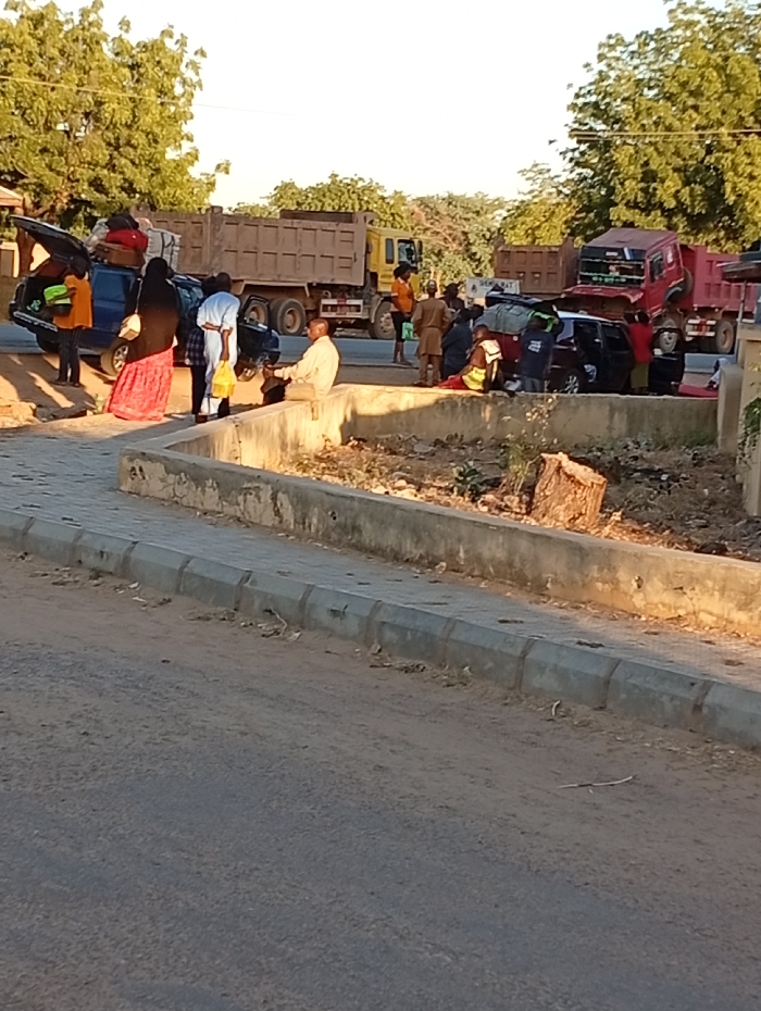 A roadside scene shows several individuals and vehicles. Two large trucks are visible, one red and one yellow. People stand near cars, with one car's trunk open and packed with items. A man sits on a concrete structure. Additional figures are scattered around the scene, suggesting either a gathering or an incident. Trees provide a backdrop to the scene, with the sky pale in the background.