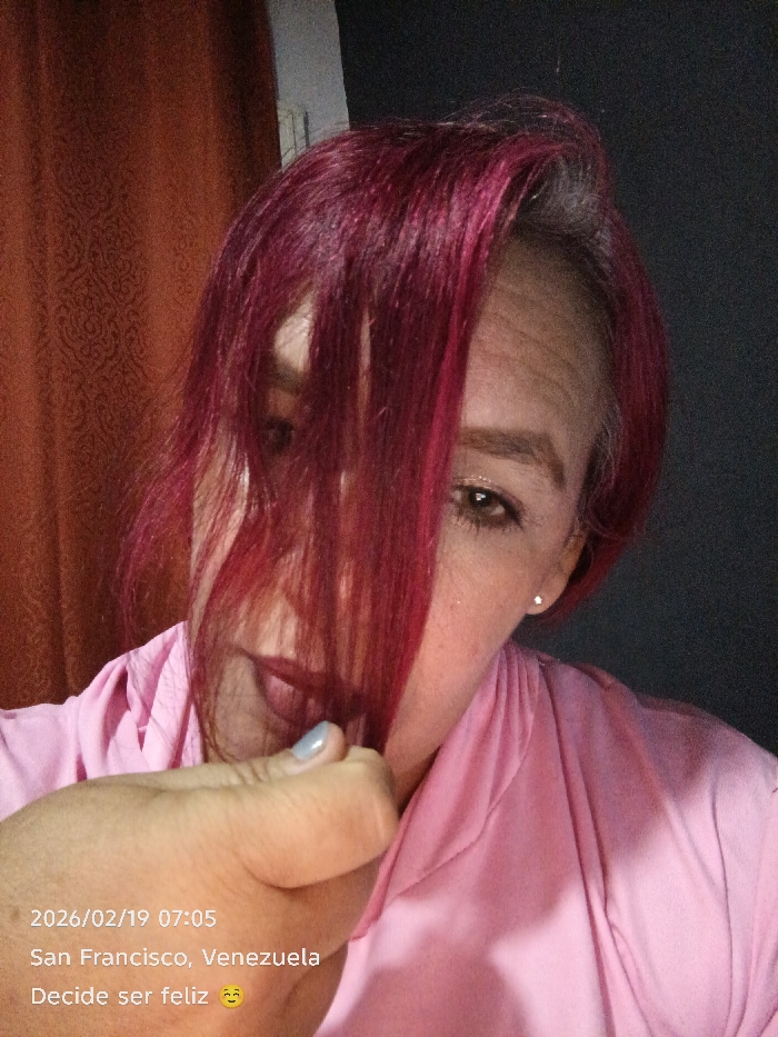 The image displays a close-up portrait of a single individual, likely female, captured indoors. The subject has bright red or magenta-colored hair, with visible grey roots near the forehead, and bangs partially obscuring the left side of the face. The right eye, which is brown, is visible, along with dark eyebrows and lips colored with dark red lipstick. A small white stud earring is present in the right earlobe. The individual is wearing a light pink garment, possibly a hooded top. A hand, with the thumb nail painted light blue, is seen in the lower left foreground, gripping a lock of the red hair. The background consists of an orange patterned curtain on the left and a plain dark grey or black wall on the right. An overlay indicates the date and time as "2026/02/19 07:05" and the location as "San Francisco, Venezuela".
