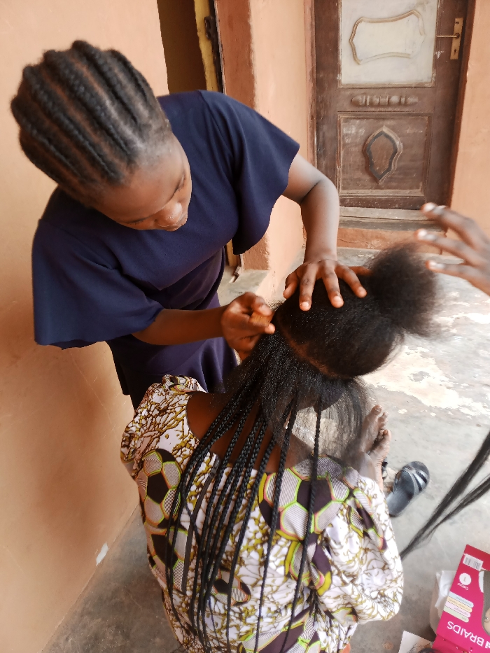 In Iju, Nigeria, an outdoor or semi-enclosed scene depicts two individuals engaged in hair braiding