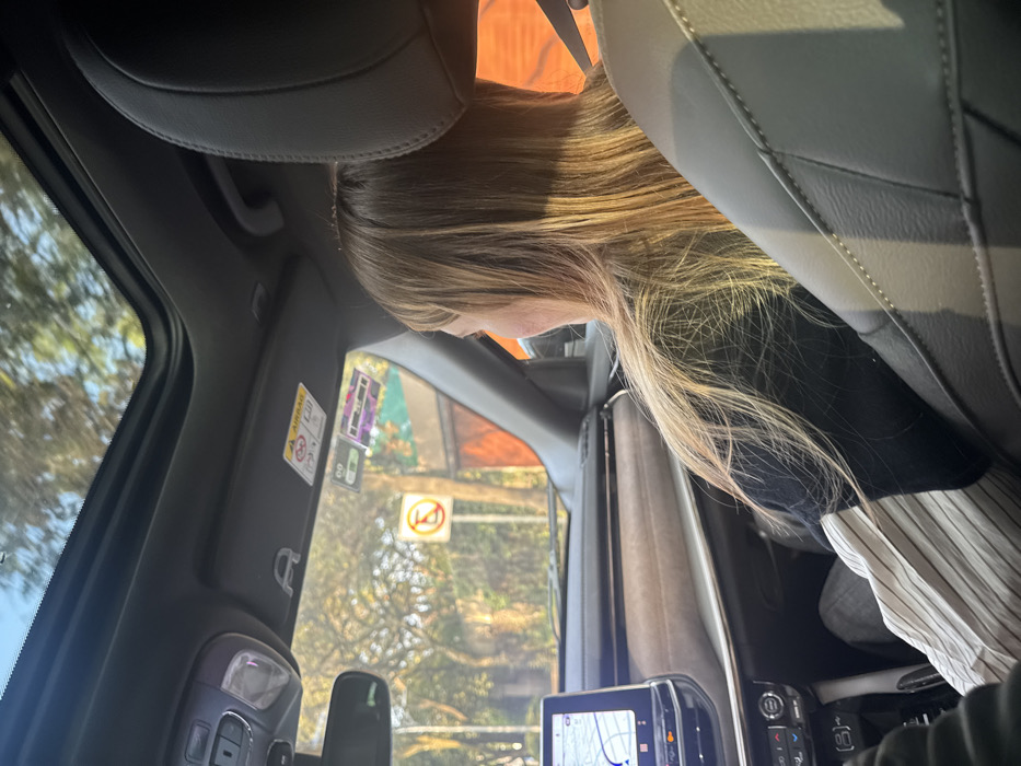 A person is seated in a car. Blonde hair is visible between the grey car seats. The car's dashboard includes a navigation screen, and a sun visor with safety stickers is lowered. Outside the window, a no smoking sign is mounted on a post, with foliage visible behind it. The view through the windshield is bright and somewhat obscured. A portion of the person's clothing, featuring a black top and white striped sleeve, is in view.
