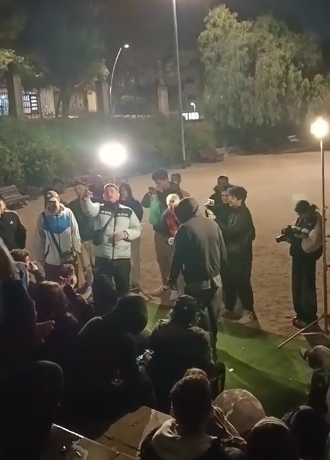 A group of approximately 20 people are gathered outdoors at night. Most of the people are standing in a circle on a small patch of artificial turf, while others are seated on concrete steps. A man in a white jacket is speaking and gesturing with his right hand. There is a street light and at least one portable light illuminating the scene. Some people are holding up their phones to record. One person is holding a camera. The ground is sandy. There are trees and buildings visible in the background. It appears they are shooting a video of the man.