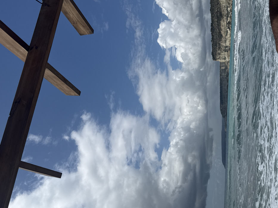 The scene depicts a coastal landscape viewed from a low vantage point, presumably from under a wooden pergola or similar overhead structure, in Episkopi Lemesou, United Kingdom. In the immediate foreground, two intersecting dark brown wooden beams are visible across the top of the frame, partially obscuring the sky. The bottom right corner reveals a portion of a dark-skinned forearm. The midground features the sea, characterized by turquoise water with white-capped waves breaking towards the viewer. In the background, to the right, a series of light-colored cliffs rise abruptly from the sea, topped with sparse, dark green vegetation. Further left, a distant, darker landmass extends along the horizon. The sky overhead is partly cloudy, with clear blue sky visible in the upper right quadrant, transitioning to a mix of white cumulus clouds and darker, heavier clouds towards the left and lower portions of the sky. No other individuals or specific actions are discernible. The environment suggests a Mediterranean climate.