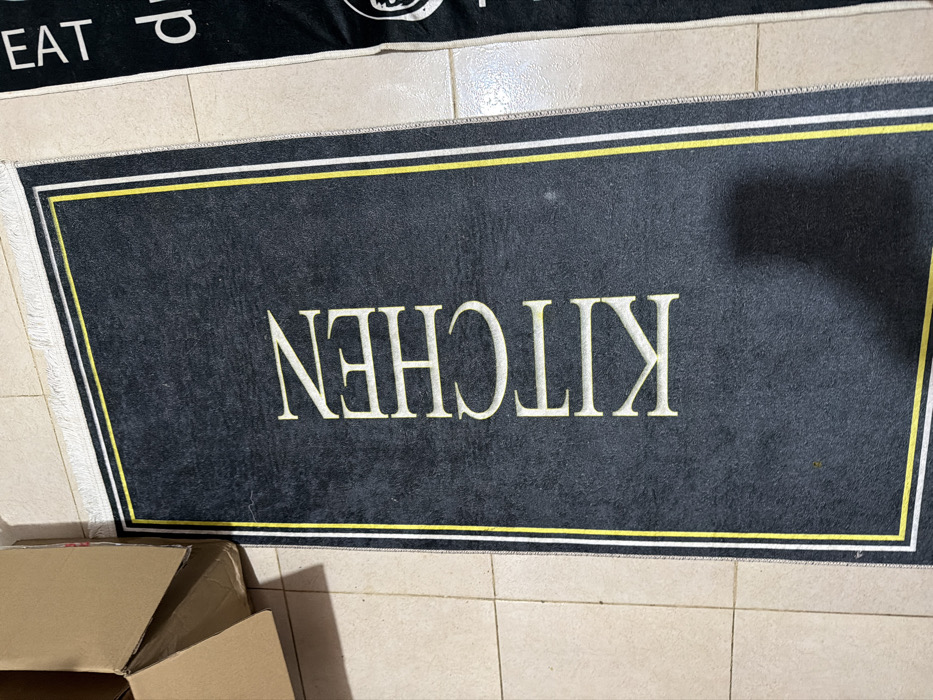 The scene, located in Fez, Morocco, depicts an indoor floor area. A dark grey rectangular kitchen mat is centrally positioned on a light brown tiled floor with light-colored grout lines. The mat features the word "KITCHEN" printed vertically in gold-yellow serif lettering, enclosed by a double border composed of an inner yellow line and an outer white line. To the upper left, an open, brown cardboard box with visible flaps rests on the tiled floor. Partially visible to the right is a second black mat displaying white text, including the word "EAT," and a partial circular white emblem. No individuals are present; the scene is static.
