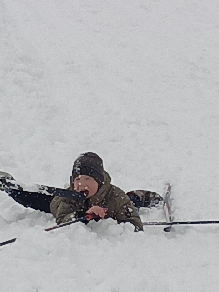 In Sarapul, Russia, a young individual is observed partially submerged in deep, white snow. The subject wears a dark knit beanie and a dark olive-green winter jacket, with visible snow particulate on their attire. Their mouth is open, exposing teeth, consistent with vocalization or an exclamatory expression. A dark-colored ski is partially visible to the subject's left, buried in the snow. The subject grasps a ski pole horizontally with their right hand, which displays a red grip component. A second ski pole is partially visible to the right, mostly buried upright in the snow. The immediate environment consists of extensive, undisturbed white snow.