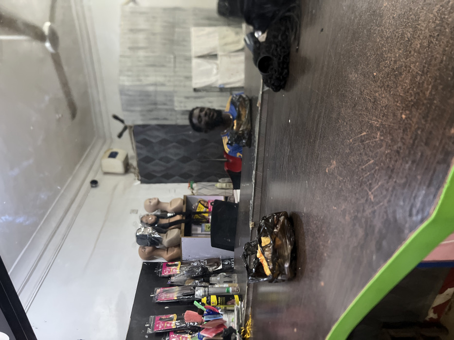 A reflection of a man wearing a blue and yellow shirt is visible on a dark wooden table. Above the table are hair extensions or wigs packaged in black plastic. Displayed on shelves behind the table are mannequin heads wearing wigs, along with hair products and supplies. The surrounding environment appears to be a beauty supply store or salon.