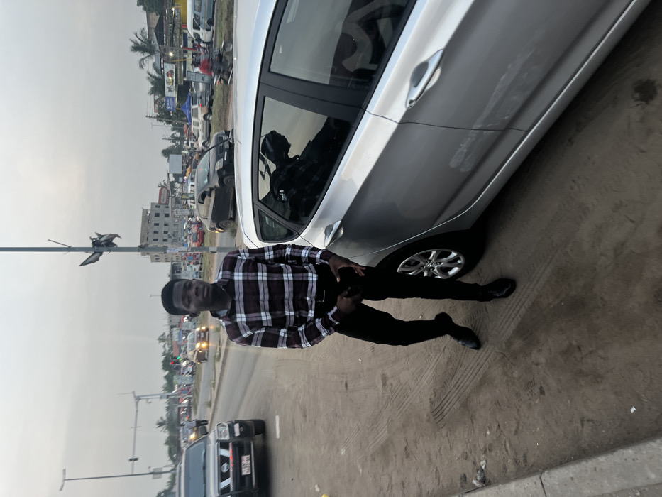 A young man in a maroon and white checkered shirt, black pants, and black shoes stands next to a silver car on a street