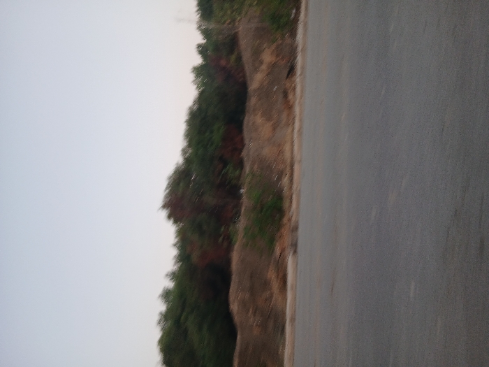 A road runs along the right side of the image. The road's surface appears smooth and gray. Adjacent to the road is a raised bank with vegetation growing on it. The vegetation transitions from low-lying ground cover near the road to denser trees further up the bank. The sky, which dominates the left side of the image, is light and overcast.