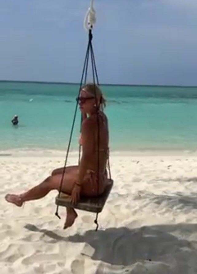 A woman in a pink bikini sits on a wooden swing hanging from a rope on a sandy beach. She wears sunglasses and has blonde hair pulled back. Behind her, the ocean is turquoise blue, with a person visible swimming in the distance. Shadows from the tree providing the swing are visible on the sand. The sky is mostly clear with a few clouds. She touches her face and looks around.