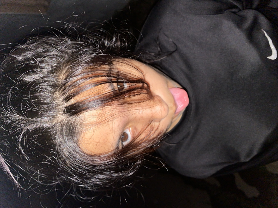 A person with dark hair and brown eyes is sticking their tongue out. They are wearing a black long-sleeved shirt with a white Nike swoosh on the right shoulder. The hair is messy and falls across their forehead. The image is taken from a slightly elevated angle, looking down at the person. The background is dark.