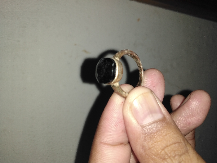 The scene depicts a close-up, slightly out-of-focus view of a human hand holding a single ring. The hand exhibits a medium skin tone, with visible fingerprints and natural skin texture on the thumb, index, and middle fingers. The fingernails are unpolished and appear clean. The hand holds the ring by its band between the thumb and index finger, orienting the ring's prominent feature towards the viewer. The ring features a circular, aged, or tarnished metallic band, possibly a silver or bronze alloy, displaying some surface irregularities and discoloration consistent with wear or environmental exposure. Mounted centrally on the band is a single, square-shaped, dark black stone or material, likely onyx or a similar dark gemstone, set within a simple bezel. The stone exhibits a smooth, reflective surface. The background consists of a plain, light-colored wall, appearing off-white or light grey, with minor textural inconsistencies and possibly some faint smudges or dust. A distinct, dark shadow of the hand and ring is cast onto the wall, originating from a light source positioned to the front and left of the subjects. The overall lighting is direct, creating clear contrasts. The scene is observed within the city of Caracas, Venezuela.
