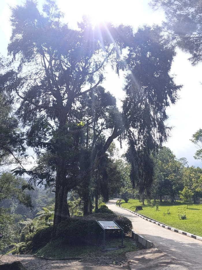 A sunlit view of a park or garden. A paved path with a black and white border curves into the distance, lined by well-maintained green lawns and trees. One large, towering tree dominates the left side, its branches reaching towards the bright sun, with some branches extending horizontally. Below the tree, a small informational sign stands near the path. A hill covered in ferns and greenery slopes down to the left of the tree. Other trees are visible in the distance, adding depth to the scene.