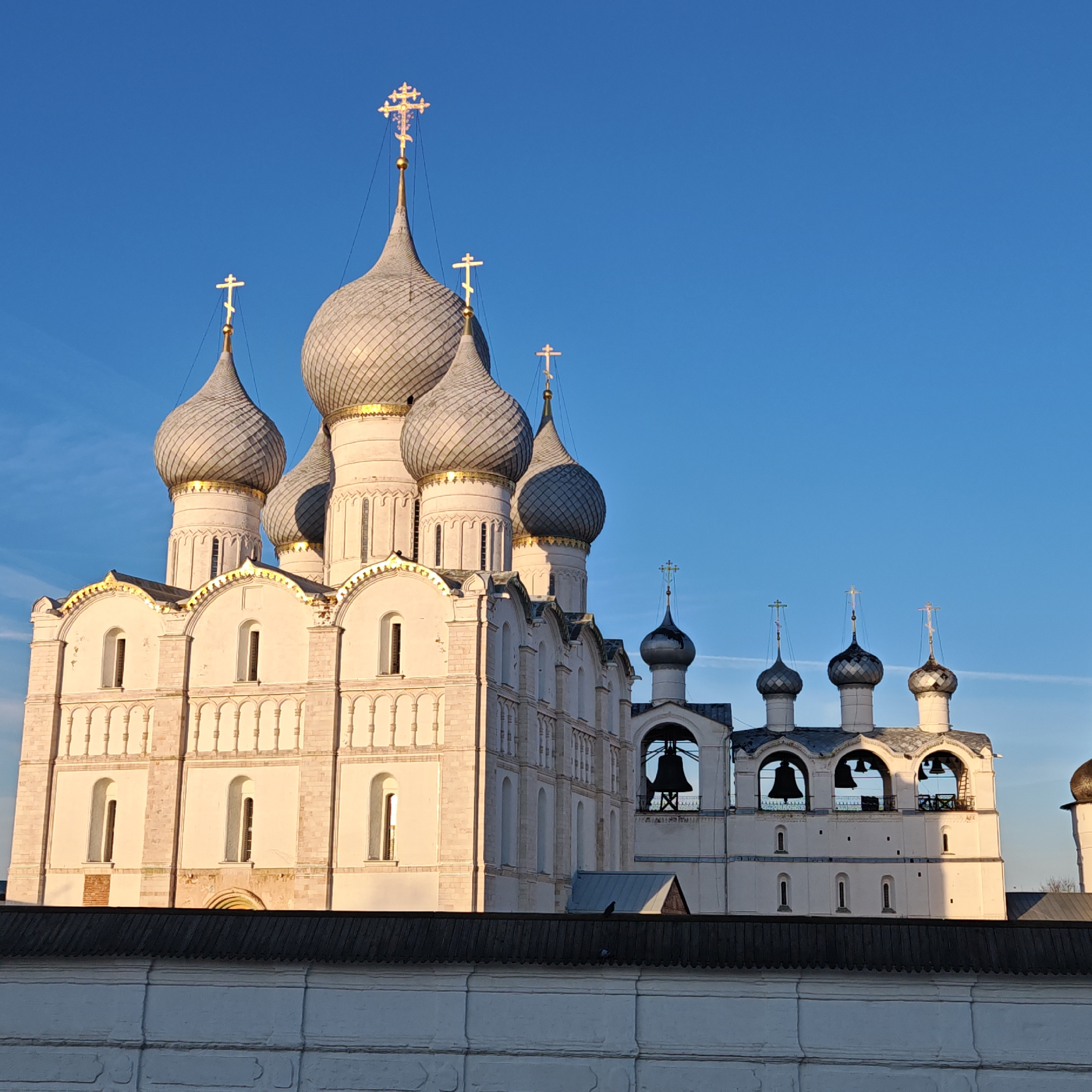 The image depicts a view of the Rostov Kremlin in Rostov, Russia, showcasing its distinctive architecture against a clear blue sky. The architectural complex includes prominent white buildings with multiple domes, each topped with a cross, typical of Russian Orthodox churches. One building is particularly large, featuring multiple tiers of arched windows and decorative elements. Adjacent to the main buildings is a bell tower with several bells hanging within arched openings. A white brick wall runs along the bottom of the frame, partially obscuring the base of the buildings. The warm light suggests it's either sunrise or sunset. No people are visible in the scene.