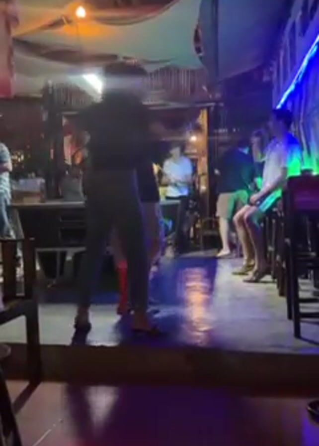 brightly lit outdoor bar area at night. The bar has a covered roof structure with various decorative lights. Several people are present, including a couple who are dancing in the center of the space. Other patrons are seated at the bar or on stools, some talking and drinking. A bartender is visible behind the counter. The flooring appears to be made of concrete or tiled material. The atmosphere suggests a casual social gathering.