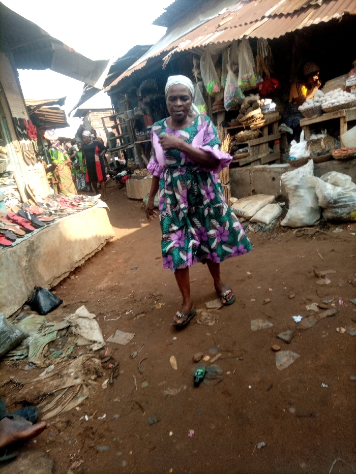 In an open-air market setting, an elderly woman wearing a floral dress and sandals is captured mid-stride. Her head is wrapped in a white covering. The market features stalls with various goods, including shoes, bags, and produce. The ground is dirt and debris, with items scattered about. Other people are visible in the background, some browsing the merchandise. The overall impression is of a bustling, commonplace scene in a traditional marketplace.