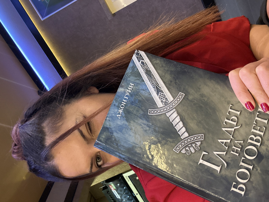 A female individual is depicted from the upper torso, holding a large book that partially obscures her face. Her long, reddish-brown hair is styled in a half-up ponytail. Her left eye is visible and open, while her right eye is closed in a wink. She wears a red garment. Her left hand, featuring red-polished fingernails, grips the book. The book has a dark, textured cover with an illustration of a sword and is titled "ГЛАДЪТ НА БОГОВЕТЕ" (The Hunger of the Gods) by "ДЖОН ГУИН" (John Gwynne) in Cyrillic script. To the left of the subject, a portion of a dark-colored gaming machine, bearing the text "MAGIC BET CLUB ULTRA", is visible. The background consists of a dark wall accented by horizontal blue and yellow-orange neon strip lighting, with a partial framed display visible to the far right. The scene is identified as occurring within a Magic Bet gaming establishment located in Plovdiv, Bulgaria, based on visible signage.