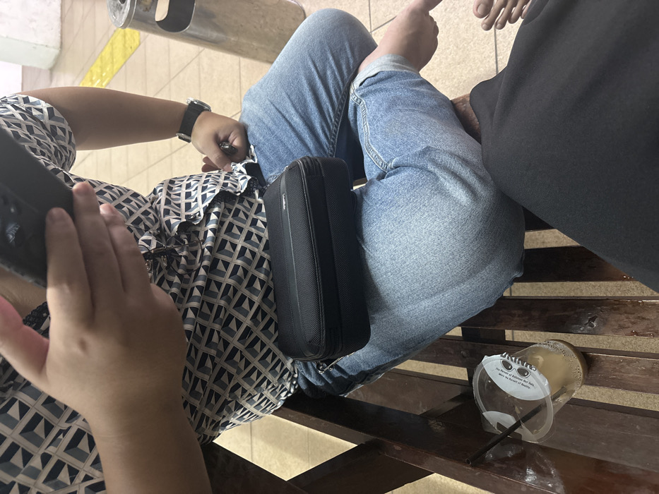 A person wearing a patterned shirt, jeans, and a watch sits on a wooden bench. A black rectangular bag rests on their lap. Next to them, a person in black clothing is also seated. A discarded plastic cup with a straw and lid sits on the bench near the feet of the person in jeans. The floor has a light-colored tile pattern.