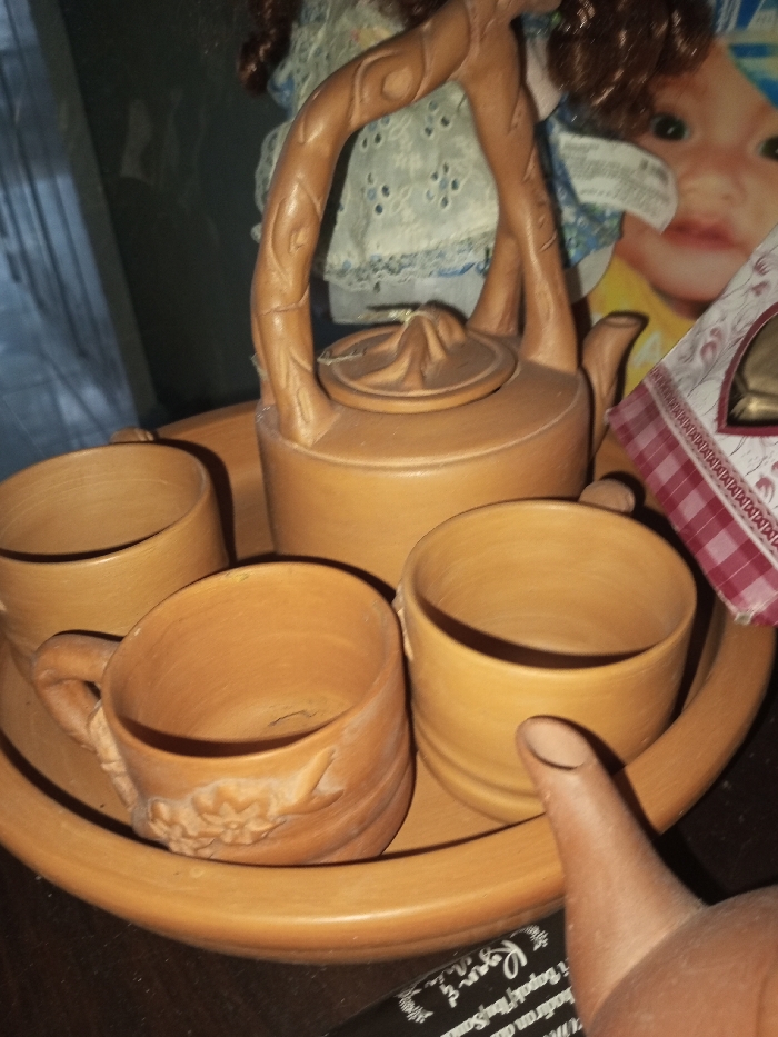 A terracotta tea set is displayed on a matching tray. The set includes a teapot with a sculpted handle and lid, accompanied by four cups. One cup has a floral design on its side. A doll with red hair is partially visible behind the tea set. An item with a red and white checkered pattern sits to the right of the teapot, and a black object is at the bottom edge of the picture.