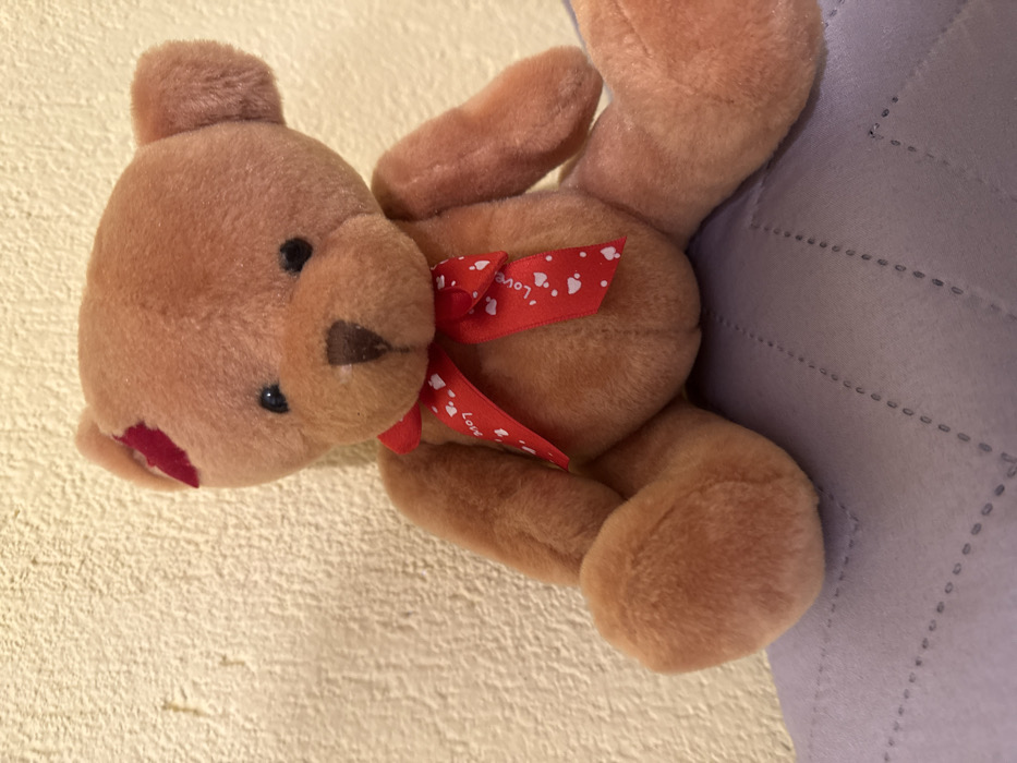 A light brownish-orange plush teddy bear is observed seated against a light yellow, textured wall. The teddy bear features black bead eyes, a dark brown stitched nose, and small rounded ears. A red, heart-shaped patch is affixed to the left side of its head. Around its neck is tied a red satin ribbon, patterned with white "Love" text and small white hearts, formed into a bow. The bear is positioned on a light purple surface, which exhibits a quilted pattern of dashed stitches forming repeating geometric shapes. The scene is static, featuring one subject, and is located within Stara Zagora, Bulgaria. No other individuals or actions are present.