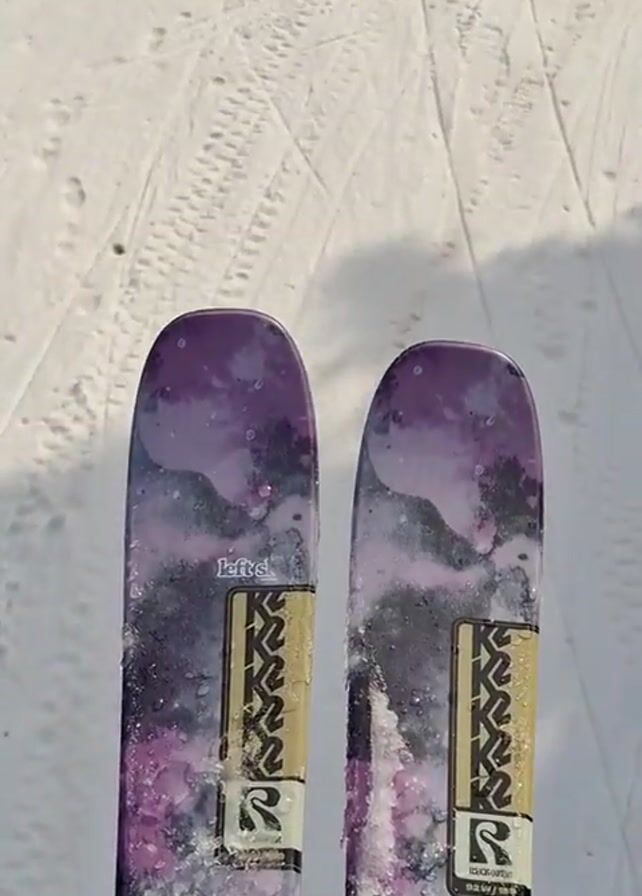 person on a ski lift, with their skis visible in the foreground. The skis are purple and silver with K2 logos. The camera moves upward, revealing a snowy ski slope with tracks and sparse trees. Above the slope, a ski lift is visible with chairs moving upwards, surrounded by a forest. The sky is not visible.